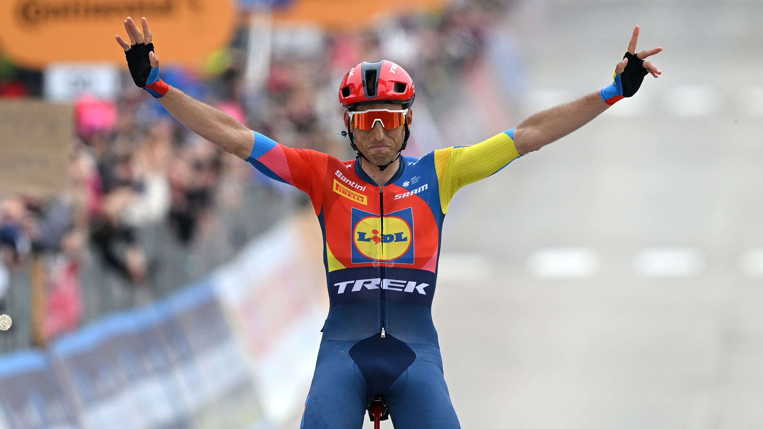 Exhibición del ciclista madrileño de Lidl-Trek, cubriendo más de cuarenta kilómetros solo al frente desde la fuga formada antes del Monte Grappa, para brindarle al conjunto de Luca Guercilena su ¡sexto! triunfo en esta Corsa Rosa. ¡Bravo, Carlos!